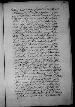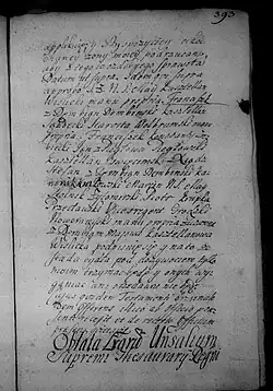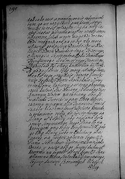 Który to testament i ostatniej woli mojej dyspozycyją, zdrowy bywszy na umyśle aprobuję, ratyfikuję, wszelką mocą stwierdzam i takowej wagi mieć go chcę, jakoby aktami grodzkiemi abo trybunalskiemi, ziemskiemi, koronnemi, roborowany był i jeśli mnie Bóg do pierwszego przyprowadziłby zdrowia, [s. 390] tak jako jest, a nie odmiennie roborowałbym go we wszytkich punktach, strzymując to, co się położyło, chyba żeby lepszy status zdrowia mógł co więcej animum advertere, salva w tym ‘’augendi minuendi recognitione’’, na co się ręką moją własną podpisuję. Działo się w Balicach, dnia 23 miesiąca Septembra [23 IX] r. P. 1703, Stanisław z S[ilna] May kasztelan wiślicki. Po podpisaniu ręką moją własną testamentu tego przydaję jeszcze i ordynuję JMP stolnikowi żytomirskiemu kobiercy par trzy przedniejszych kutów, pas dziany jedwabny ciągnionym złotem zarabiany, drugi niebieski turecki w pasy złote stryjecznemu mojemu, dla synowców moich. Szabla blachmalowa złocista kozacka z rękojeścią rybią do Częstochowej na ścianę w kaplicy, aby oddana była, proszę. Stryjecznego mego, pana Jana, któregom przy sobie konserwował, gdy go Bóg dłuży, lubo w kalectwie mieć raczy na świecie, zalecam JMP stolnikowi żytomirskiemu jako bratu i proszę, aby go [do] śmierci dochował, któremu na pogrzeb do rąk JMP Marcina Maia stolnika żytomirskiego leguję 9 czerw. zł. [s. 391] Dług zaś winny JMP Majowi Marcinowi stolnikowi żytomirskiemu, stryjecznemu bratu memu około piąci tysięcy, jako jest w moich konnotowane minucyjach i o nim moja kochana żona wie, osobliwie wypłacić i oddać.