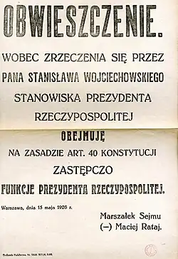 Do p. Marszałka Sejmu Macieja Rataja. Wobec wytworzonej sytuacji uniemożliwiającej mi sprawowanie urzędu Prezydenta Rzeczypospolitej, zgodnie ze złożoną przez mnie przysięgą, zrzekam się tego urzędu i zgodnie z art. 40 konstytucji przekazuję P. Marszałkowi Sejmu uprawnienia Prezydenta Rzeczypospolitej. Jednocześnie załączam prośbę o dymisję dotychczasowego rządu. Wilanów, 14 maja 1926[38].