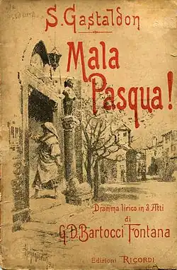 Gastaldon po raz pierwszy zmierzył się z twórczością sceniczną, pracując nad czteroaktową operą z prologiem Fatma do libretta Marca Pragi, jednak dzieło to nigdy nie zostało wystawione. Natomiast w roku 1888, kiedy wydawnictwo muzyczne Sonzogno ogłosiło konkurs na operę jednoaktową, Gastaldon zgłosił swój utwór Mala Pasqua!, zainspirowany opowiadaniem Rycerskość wieśniacza Giovanniego Vergi, które później sam autor przerobił na sztukę. Do konkursu stanął wtedy również inny młody kompozytor, Pietro Mascagni, ze swoją operą Rycerskość wieśniacza, której libretto oparto na tym samym opowiadaniu. Gastaldon jednak wycofał się z konkursu, kiedy konkurent Sonzogno, Casa Ricordi, zaproponował mu publikację partytury i premierę w rzymskim Teatro Costanzi. Mala Pasqua! w formie trzyaktowej została tam wystawiona bez większego powodzenia 9 kwietnia 1890 roku. Mascagni natomiast wygrał konkurs i półtora miesiąca później w tym samym teatrze odniósł swoją Rycerskością wieśniaczą ogromny sukces, skazując tym samym dzieło Gastaldona na szybkie zapomnienie[10].