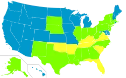 Pacyfik: Baker, Guam, Howland, Jarvis, Johnston, Kingman, Mariany Północne, Midway, Palmyra, Samoa Amerykańskie, Wake; Atlantyk: Wyspy Dziewicze Stanów Zjednoczonych, Navassa, Portoryko | ||||