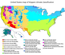 Główny podział na strefy klimatyczne stosowany w systemie klasyfikacji klimatów Köppena dzieli Stany Zjednoczone południkowo na część wschodnią i zachodnią[6]. Granica podziału przebiega wzdłuż Gór Skalistych.