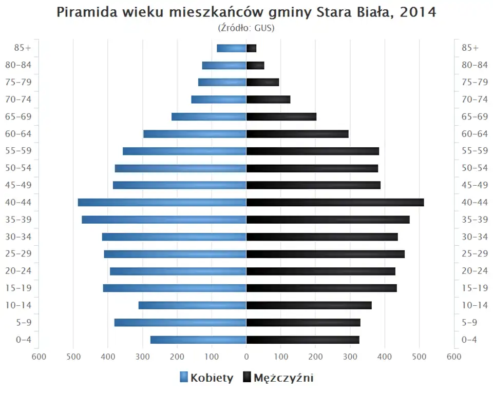 - Piramida wieku mieszkańców gminy Stara Biała w 2014 roku[1].