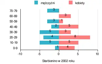 (w przedziałach wiekowych w 2002 roku)OGÓŁEM 0-9 10-19 20-29 30-39 40-49 50-59 60-69 70-79 I. OGÓŁEM os. 52 5 10 12 8 7 4 3 3 — odsetek % 100 9,6 19,2 23,1 15,4 13,4 7,7 5,8 5,8 1. WEDŁUG PŁCI A. Mężczyzn os. 23 1 5 4 5 2 3 — 3 — odsetek % 44,2 1,9 9,6 7,7 9,6 3,8 5,8 — 5,8 B. Kobiet os. 29 4 5 8 3 5 1 3 — — odsetek % 55,8 7,7 9,6 15,4 5,8 9,6 1,9 5,8 —