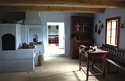 W izbie zachował się murowany, oblepiony gliną piec z okapem i zapieckiem do spania. Wyposażenie domu stanowią eksponaty etnograficzne pochodzące z dawnych wierzchosławickich zagród chłopskich[4].
