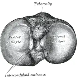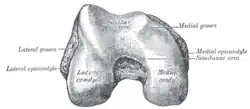 - kłykieć przyśrodkowy kości udowej (condylus medialis femoris) – powierzchnia stawowa rzepkowa przyśrodkowa (facies articularis medialis patellae)