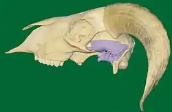 Torebka stawu żuchwowego wtórnego wzmacniana jest przez więzadło boczne oraz więzadło doogonowe. To ostatnie przebiega od wyrostka zastawowego kości skroniowej do wyrostka kłykciowego kości zębowej[29].