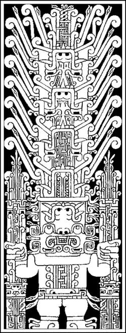 Oglądany z jednej strony wizerunek przedstawia antropomorficzną postać z kłami oraz szponami ptaków. W rękach trzyma berła, które przypominają kaktusa San Pedro, z którego duchowe elity piły sok wywołujący halucynogenne reakcje mające zbliżyć ich do bóstw, które czcili. Oczy postaci spoglądają w górę w kierunku ogromnego nakrycia głowy, przedstawiającego wizerunki drapieżnych zwierząt ułożonych jedne na drugich. Z kolei z prawej i z lewej strony pasa wystają węże[4][6].