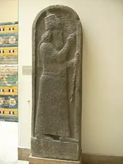 Inskrypcja klinowa na steli pozwoliła zidentyfikować przedstawionego na niej władcę jako Sargona II, króla Asyrii[2]. Stojący król, przedstawiony z profilu, skierowany jest w prawą stronę w kierunku ośmiu symboli boskich umieszczonych przed nim, na wysokości jego głowy[2]. Sargon II ubrany jest w długą szatę królewską ozdobioną frędzlami i nosi charakterystyczne nakrycie głowy noszone tylko przez władców asyryjskich[2]. W lewej ręce król trzyma maczugę, natomiast jego prawa ręka jest wzniesiona w geście modlitwy[2]. Przed królem, na wysokości jego głowy, umieszczonych zostało osiem symboli boskich: tiara wielorożna (symbol boga Aszura), sierp księżyca (symbol boga Sina), gwiazda (symbol bogini Isztar), piorun (symbol boga Adada), łopata/motyka (symbol boga Marduka), rylec pisarski (symbol boga Nabu), siedem kropek (symbol bogów Sebitti) i uskrzydlony dysk słoneczny (symbol boga Szamasza)[2].