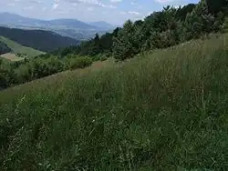 ![]() Polana Stoły. Na dole Łysa Góra, w oddali szczyty Beskidu Wyspowego i Gorców | |