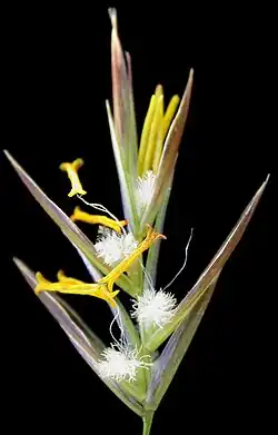 - Zebrane w równowąskie kłoski długości około 3 cm, te z kolei zebrane we wzniesioną wiechę długości 10–15 cm. Plewa dolna jednonerwowa, górna - trójnerwowa. Plewka dolna dwuzębna, długości 10–13 mm. Pylniki jaskrawożółte[5].