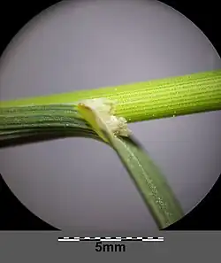 - Pochwa liściowa zrośnięta, zamknięta. Blaszka liściowa naga, do 18 mm szerokości, żeberkowana z wyraźnym nerwem środkowym tzw. "kilem".