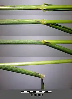 - Szerokości około 2 mm, zwijające się po wyschnięciu. Dolne liście orzęsione lub owłosione na brzegu. Języczek liściowy długości od 1 do 3 cm, ząbkowany, bez uszek[5].