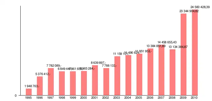 Rysunek 1.2 Wydatki ogółem w Gminie Stopnica w latach 1995-2010 (w zł)[6]