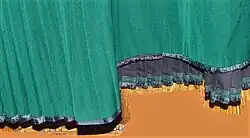 | szewiotka | spódnica uszyta z szewiotu, miała kolor buraczkowo-czerwony, była plisowana, szerokości 5 metrów. Równolegle do dolnej krawędzi obszyta trzema czarnymi, wąskimi, aksamitnymi taśmami[3]. | |