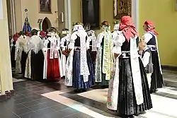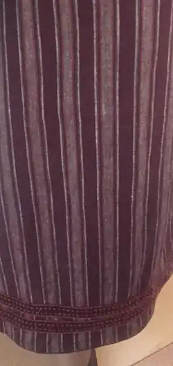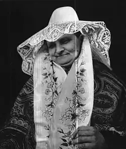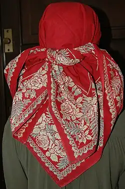 duża chusta (ok. 130 × 170 cm), wykonana z wełny o różnej grubości, w zależności od pory roku, w której się ją nosiło. Zazwyczaj była czarna, brązowa lub granatowa, często w kratę i ozdobiona frędzlami. Chustę tę nosiło się w ciągu tygodnia składając ja na pół i zarzucając na plecy, w czasie mrozów także na głowę[2]. |