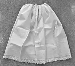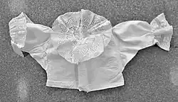 spodnica | spódnica z białego płótna, ozdabiana ręcznym haftem dziurkowym (haft angielski), w późniejszym czasie stosowano obszycia z fabrycznej koronki klockowej. |