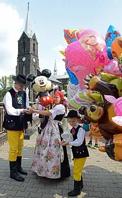 rodzaj kamizelki, gorsetu czy bezrękawnika, zapinany z przodu na guziki. Szyty z cienkiego sukna, zazwyczaj w kolorze czerwonym, dla starszych mężatek granatowy lub czarny (zależnie od miejscowości). Był elementem najbardziej galowej wersji stroju[1] | |