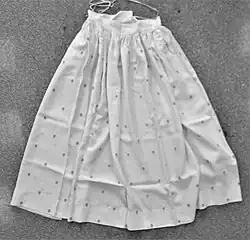 fartuch, prostokątny kawałek materiału przymarszczony w górnej części i zebrany w oszewkę, do której doszyte są troczki. Troczki krzyżowało się z tyłu w pasie i wiązało się z przodu, chowając końcówki pod fartuchem. Od przodu fartuch całkowicie zasłaniał spódnicę. Najbardziej elegancki był fartuch jedwabny, fabrycznie drukowany lub ręcznie malowany w równomiernie rozłożone kwietne bukiety. Zakładano go wierzcheń[1][2]. |