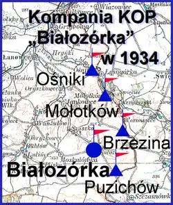 - strażnica KOP „Brzezina” ⇔ strażnica KOP „Białozórka” – 1928[16], 1929[17], 1931[5], 1932[18], 1934[19]