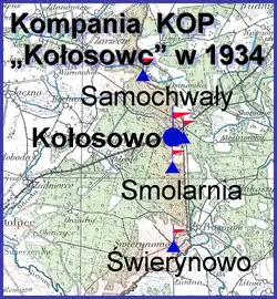- strażnica KOP „Smolarnia” ⇔ Odcinek podlega bezp. odwodowej kompanii - 1938[8]