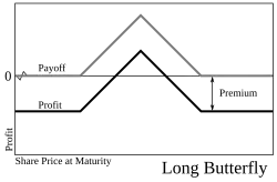 - Opcja kupna (short call butterfly spread) – inwestor wystawia opcję kupna o relatywnie niskiej cenie wykonania K1, relatywnie wysokiej K3 i kupuje dwie opcje kupna o cenie wykonania K2 pomiędzy K1 i K3. Wartość K2 powinna być zbliżona do aktualnej ceny instrumentu bazowego.