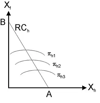 W dalszej analizie możemy wyodrębnić zbiór krajowych krzywych jednakowego zysku tzw. izoprofit, przedstawionych na wykresie jako πh1<πh2<πh3. Każdy z punktów na danej izoproficie określa jednakowy poziom zysku dla firmy w Kraju. Gdy wielkość produkcji Xf za granicą spada, zwiększają się zyski firmy w Kraju, tak więc przesuwa się ona na wyższą krzywą jednakowego zysku w miarę poruszania się w dół, wzdłuż swej krzywej reakcji. Z tego wynika fakt, iż krzywa reakcji to nic innego, jak tylko zbiór punktów, na których firma w Kraju maksymalizuje swoje zyski, przy danych poziomach produkcji Zagranicy Xf; krzywa RCh łączy ze sobą „najwyższe” punkty krzywych jednakowego zysku. Dodatkowo należy zauważyć, że najlepszym punktem w którym może znaleźć się Kraj jest punkt A, który oznacza, iż firma krajowa stała się monopolistą na rynku międzynarodowym.