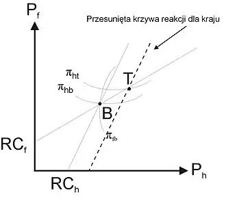 Kolejny wykres dopełniony został poprzez dodanie, odpowiadającej krzywej RCh, krzywej reakcji Zagranicy RCf. Przecięcie się tych krzywych wyznacza nam punkt B równowagi Bertranda. W punkcie tym dwie krzywe jednakowego zysku, Kraju πhb oraz Zagranicy πfb są do siebie prostopadłe. Oznacza to, że każda z firm dokonuje wyboru optymalnego poziomu ceny na poziomie ceny konkurenta, a obszar pomiędzy tymi krzywymi wyznacza region, w zakresie którego kooperacja pomiędzy firmami w Kraju i za granicą co do zwiększenia cen wpłynie dodatnio na zyski obu konkurentów. Następnie dokładamy do modelu aktywny rząd, tak jak w poprzednim modelu. Krzywą reakcji Zagranicy RCf, potraktujemy jako ograniczenie, a zadanie rządu krajowego określimy jako pomoc w celu osiągnięcia przez firmę działającą w Kraju wyższego poziomu zysku, w zgodzie z przyjętym przez nas ograniczeniem. Punktem optymalnym dla Kraju jest punkt T, wraz z odpowiadającą mu krzywą jednakowego zysku πht na wykresie.