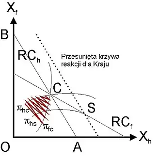 Krzywa reakcji dla Kraju opisana jest jako RCh. Jest to krzywa malejąca, gdyż w przypadku wzrostu wielkości produkcji za granicą Xf, znacząco kurczy się rynek pozostały dla firmy krajowej, przez co aby pozostać przy wyborze optymalnym, musi ona zredukować swoją wielkość produkcji Xh. Warto przy okazji przeanalizować krańcowe punkty na wykresie, z których punkt A oznacza wielkość produkcji Kraju w przypadku gdy zagraniczna produkcja wynosi zero, natomiast punkt B to sytuacja odwrotna, gdzie na rynku międzynarodowym jedynym producentem pozostaje Zagranica.