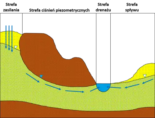 Drenaż może zachodzić do wód powierzchniowych (źródeł, bagien, cieków, jezior, mórz) lub do innych warstw wodonośnych.