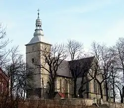 - gotycki kościół pw. Wniebowzięcia NMP z 1378 roku; rozbudowany w latach 1895–1896 w stylu neogotyckim; zniszczony w czasie działań wojennych 1944–1945, w latach powojennych odrestaurowany; nawa kościoła XIV-wieczna; prezbiterium i kaplice MB i Pana Jezusa dobudowane w XIX w. Do nawy, od strony zachodniej przylega wieża, która w przeszłości pełniła funkcje obronne (zachowane otwory strzelnicze); wewnątrz wieży znajduje się tablica erekcyjna z XIV wieku; krzyżowo-żebrowe sklepienie nawy kościoła wsparte jest na jednym, centralnie ustawionym filarze; do wnętrza świątyni wiodą ostrołukowe portale. Kościół został wpisany do rejestru zabytków nieruchomych (nr rej.: A.59 z 13.01.1957 i z 22.06.1967)[8].