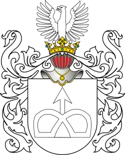 W polu jakby korona zamknięta, z zaćwieczoną rogaciną. Klejnot: pół orła. Barwy nieznane[2].