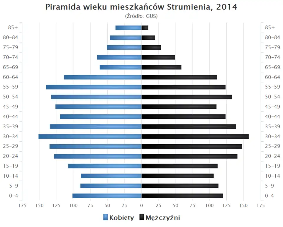 Piramida wieku mieszkańców Strumienia w 2014 r.[18]: