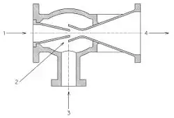 Ciecz robocza, podawana przez pompę zasilającą poprzez dopływ (1), dostaje się do dyszy (2), gdzie następuje przyrost prędkości cieczy kosztem spadku ciśnienia (zobacz prawo Bernoulliego). Spadek ciśnienia w komorze ssawnej jest wystarczający do podniesienia cieczy lub zawiesiny ze zbiornika ssawnego (3). Obie ciecze, zasilająca i pompowana, mieszają się w komorze wylotowej (4).