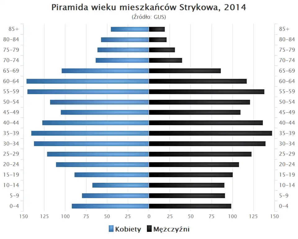 - Piramida wieku mieszkańców Strykowa w 2014 roku[14].