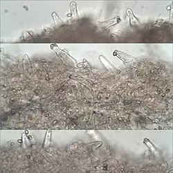 Zarodniki 6,5–10 × 4,5–6,5 µm, jajowate, rzadziej nieco gruszkowate, z dzióbkiem. Podstawki 28–30 × 7–8 µm. Cheilocystydy i pleurocystydy 40–68 × 11–21 µm z kryształkami. Ich ściana w wodorotlenku amonu barwi się na żółto. Kaulocystydy z kryształkami lub bez. Ich ściana w wodorotlenku amonu również barwi się na żółto[4].