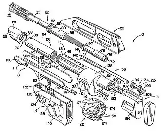 „Jackhammer” jest bronią samoczynno-samopowtarzalną zbudowaną w układzie bullpup strzelającą z zamka zamkniętego. Po naciśnięciu spustu następuje strzał, a lufa zakończona urządzeniem wylotowym pod wpływem ciśnienia gazów prochowych przesuwa się do przodu. Następuje odryglowanie, a następnie połączone z lufą cięgło współpracując z wycięciami bębna powoduje obrót bębna z amunicją o 1/10 obrotu. Następnie lufa pod wpływem sprężyny powrotnej wraca w tylne położenie i rygluje się z bębnem. Ruch cięgła jest także wykorzystywany do napięcia sprężyny mechanizmu uderzeniowego. Sprężynę uderzeniową można zwolnić bez strzału dźwignią umieszczoną wewnątrz wycięcia kolby.