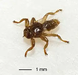 Ciało długości od 5 do 6 mm, barwy brunatnej. Szeroka głowa ma małe oczy, wyraźnie szerszą niż dłuższą płytkę śródcieminiową, trzykrotnie szerszą niż dłuższą płytkę zacieminiową oraz 2-3 długie szczecinki boczne i jedną tylnokątową na parafrontaliach. Głaszczki szczękowe tak długie jak przód głowy. Tułów gęsto oszczeciniony. Śródplecze ze szwem ciągnącym się od środka po tarczkę[2] i 15-18 szczecinkami środkowo-bocznymi. Płaty przedpiersia z kolcami w przedniej ponad ½ do ⅔ długości[3]. Na tarczce 6 do 8 długich szczecinek. Skrzydła długości od 5,5 do 6 mm każde, są odrzucane po znalezieniu żywiciela. Samica ma trzeci tergit odwłoka znacznie mniejszy niż piąty i czwarty[2].