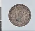 W centralnej części znajduje się dziewięciopolowa, ukoronowana tarcza z herbem Rzeczypospolitej Obojga Narodów, otoczona łańcuchem Orderu Złotego Runa, dookoła którego wybito legendę: