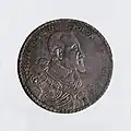 Na tej stronie monety umieszczono popiersie królewskie bez korony z twarzą skierowaną w prawo i Orderem Złotego Runa, na samym dole litery S A będące inicjałami rytownika Samuela Ammona, dookoła otokowy napis: