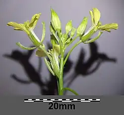 - Jasnożółte, po przekwitnieniu bielejące[11], zebrane po 15-25 w grona w szczytowych częściach pędów[12]. Działki kielicha o długości do 5 mm, wąskoeliptyczne, odstające, u nasady nieco wybrzuszone. Zewnętrzna para działek ma charakterystyczne rożkowate wyrostki pod szczytem. Płatki korony są odwrotnie jajowate, długości do 9 mm, u nasady zwężone w długi i szeroki paznokieć[11], którego długość jest podobna do długości działek[4]. Pręciki o żółtawych nitkach długości od 2 do 6 mm z podługowatymi pylnikami o długości ok. 2 mm. Wydłużona zalążnia zawiera od 90 do 120 zalążków[4]. Zwieńczona jest krótką (ok. 0,5 mm długości) szyjką zwieńczoną rozwidlonym znamieniem[11].