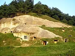- ↑ Zdjęcia jaskiń a także grafika przedstawiająca rekonstrukcję grodu (ukr.)