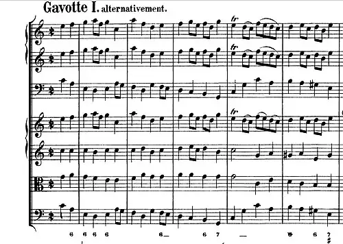 - Bourrée I/II (Bourrée I w C-dur, Bourree II – środkowa część, w c-moll. Metrum: przekreślone 2)