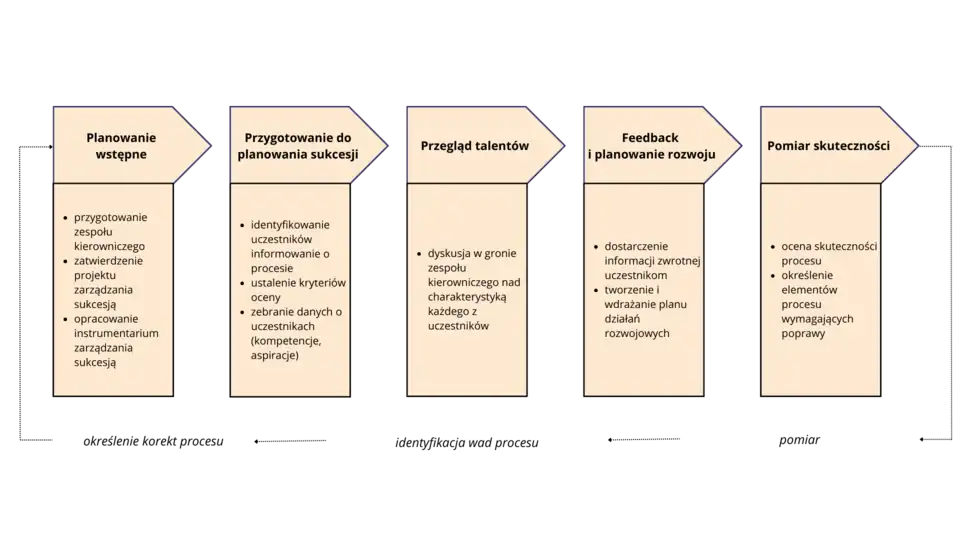 Ostatnia faza procesu sukcesji obejmuje monitorowanie skuteczności działań i wprowadzanie niezbędnych korekt. Na podstawie ustalonych wskaźników ocenia się postępy sukcesorów oraz identyfikuje obszary wymagające poprawy. Regularna analiza procesu sukcesji pozwala na jego dostosowywanie do zmieniających się potrzeb organizacji oraz zmiennych warunków rynkowych[9].
