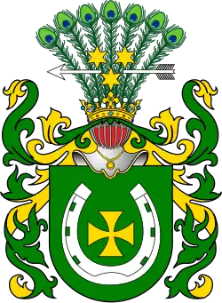 Klejnot: ogon pawi przeszyty strzałą, na którym trzy gwiazdy złote (2 i 1).