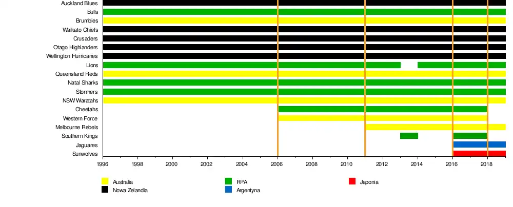 Wykres przedstawiający czasookresy w których występowały drużyny lidze Super Rugby (pomarańczowe kreski oznaczają zmianę liczby drużyn w lidze i jej reorganizację)