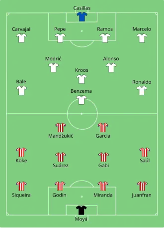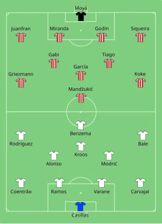 Mario Mandžukić strzelił jedyną bramkę w tym spotkaniu. 80 sekunda spotkania, strzał prawą nogą z pola karnego i gol[4]. W 26 minucie menadżer Atletico Diego Simeone dostał czerwoną kartkę[5].