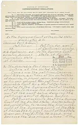 3 czerwca 1961 bezdomny włóczęga ze stanu Floryda, Clarence Earl Gideon został oskarżony o włamanie do sali bilardowej, z której skradziono około 65 dolarów amerykańskich, kilka butelek piwa i kilka butelek Coca-Coli[47]. W trakcie postępowania przed sądem stanowym hrabstwa Bay (Bay County Circuit Court), poprosił sędziego Roberta L. McCrary’ego Jr. o wyznaczenie mu obrońcy, jako że nie było go stać na opłacenie adwokata[48]. Sędzia odmówił i poinformował oskarżonego, że prawo do korzystania z obrońcy, zgodnie z florydzkim prawem, było zagwarantowane jedynie w procesach sądowych dotyczących zabójstw[48]. Sąd skazał Gideona na najsurowszą możliwą karę za to przestępstwo – na 5 lat pozbawienia wolności[49]. Gideon złożył odwołanie od decyzji sądu pierwszej instancji, rozpatrzone negatywnie przez Sąd Najwyższy Florydy[50]. Powód twierdził w owym odwołaniu, że niewyznaczenie obrońcy przez sędziego naruszyło jego konstytucyjne prawa[50]. Następnie złożył odręcznie napisaną petycję o ponowne rozpatrzenie sprawy w Sądzie Najwyższym Stanów Zjednoczonych[50].