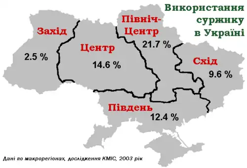 Według badań socjologicznych surżykiem posługuje się 15–20% ludności Ukrainy, przede wszystkim w obwodach dniepropetrowskim, połtawskim, sumskim i czernihowskim.