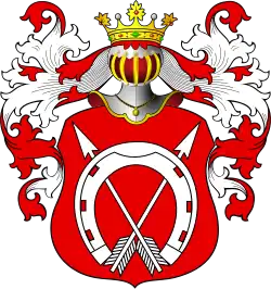 W polu czerwonym[1] lub błękitnym[2][3] podkowa barkiem do góry, w środku której dwie strzały żeleźcami do góry ukośnie skrzyżowane. Nad hełmem korona bez żadnego klejnotu. Wariant: w klejnocie skrzydło sępie, a przez nie strzała z żeleźcem w lewą obrócona; tymczasem pole tarczy błękitne[1].