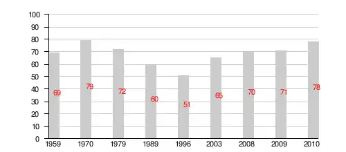 | Rok | 1959 | 1970 | 1979 | 1989 | 1996 | 2003 | 2008 | 2009 | 2010 |